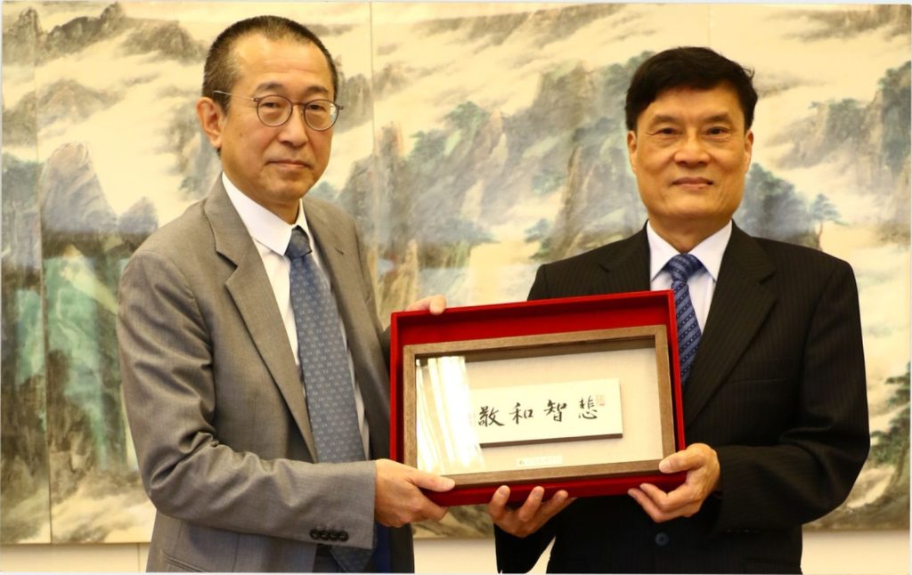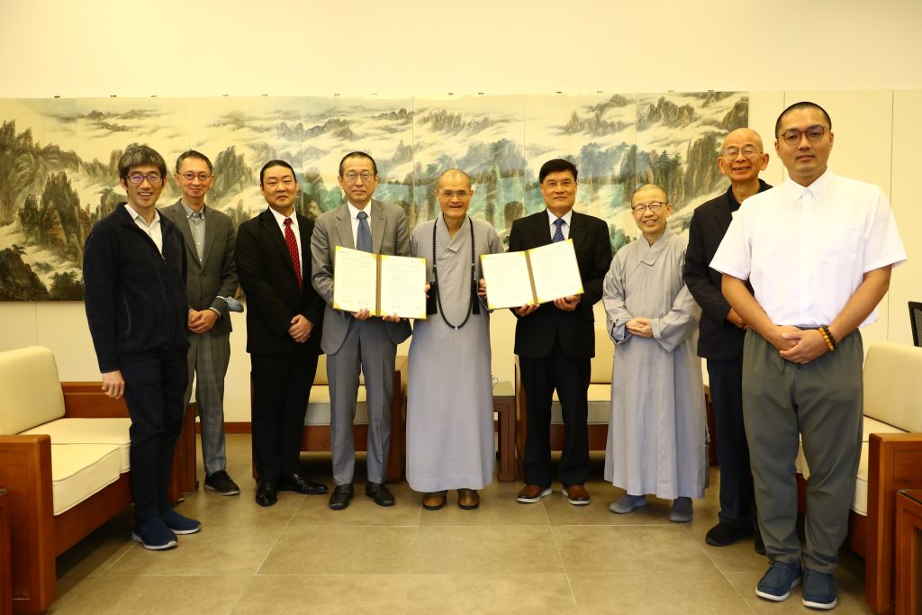 2026年3月25日,本校與日本身延山大學(Minobusan University)正式簽署學術友好交流協議。身延山大學望月海慧校長(President Mochizuki Kaie)與金炳坤教授(Professor Kim Byung-kun)專程來訪,由本校陳定銘校長代表簽約,方丈和尚果暉法師親臨祝福。
